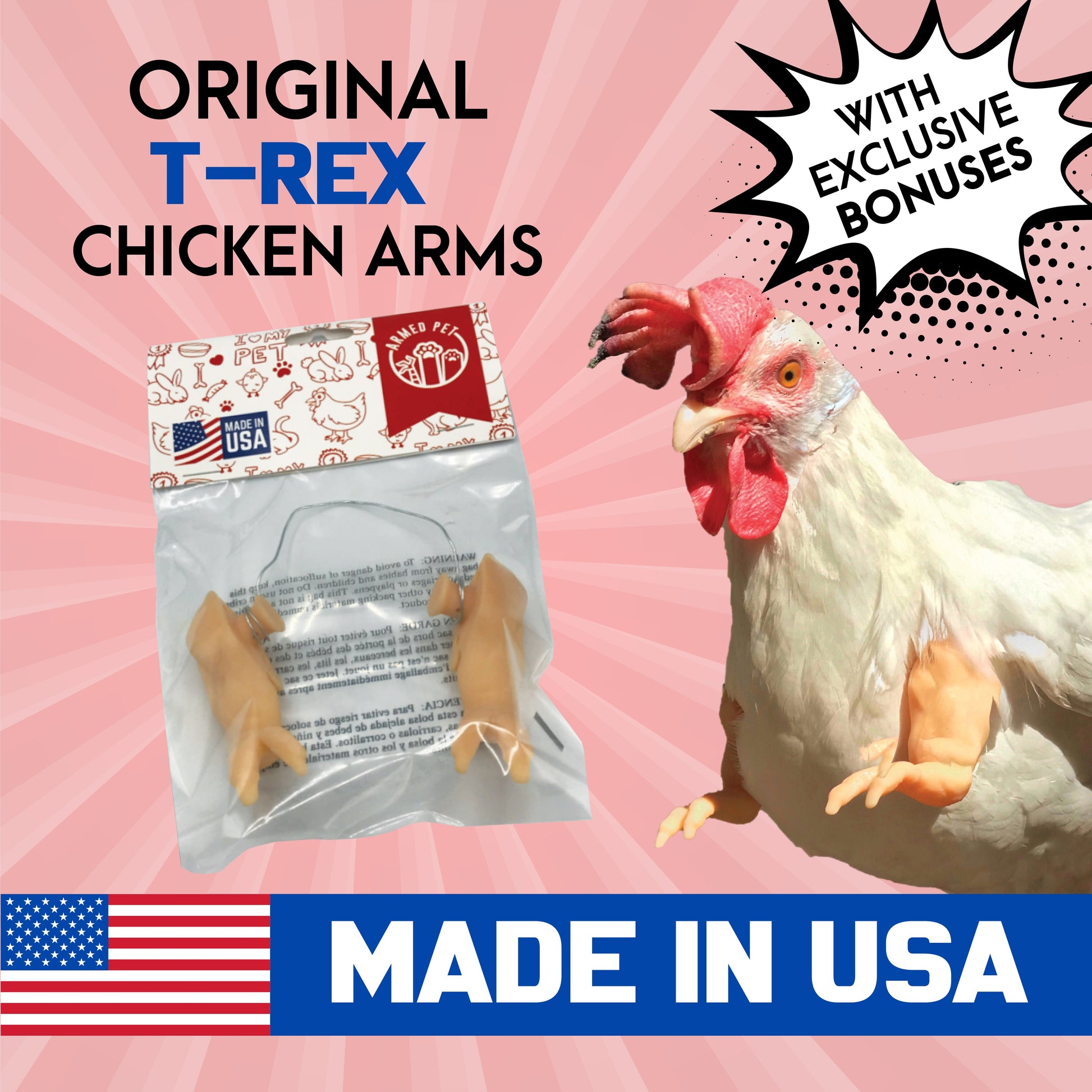 Make Your Pets Go Viral! The Original T-rex Chicken Arms costume accessory are suitable for fun facebook and instagram pictures, participating in Halloween, Christmas party, cosplay, costume contests, pet themed party and so on. Specifications: Material: Resin Plastic Color: Color is specified in title. Colors may vary as you see in the photos. final version may vary from what you receive. Example: If flesh color is selected, it can vary from beige to a light pink hue. If black, it can vary from glossy black or matte black. Size (inch): Package include: 1 pair of Chicken T-Rex Arms(small) Note: The wire attached to the chicken arms is adjustable. All items are made with our 3D Printing locally. The 3D printing process means that there may be slight imperfections in any 3D printed object, but everything will be similar to how it looks in the photographs. USA MADE BRINGING BACK MANUFACTURING TO AMERICA We created various designs of novelty items for your chickens. These are made here in Texas, and shipped from Texas. We print them on demand once you order. We would love to see pics of your chickens wearing these, tag us in your social media as #Armepet. If you have any ideas of what we can design for you, feel free to contact us. We're a small team of online cowboys & cowgirls from Texas, we want to retool America and bring back Manufacturing to the U.S... even if its a small impact. Each purchase is your support for Made in 'Murica!