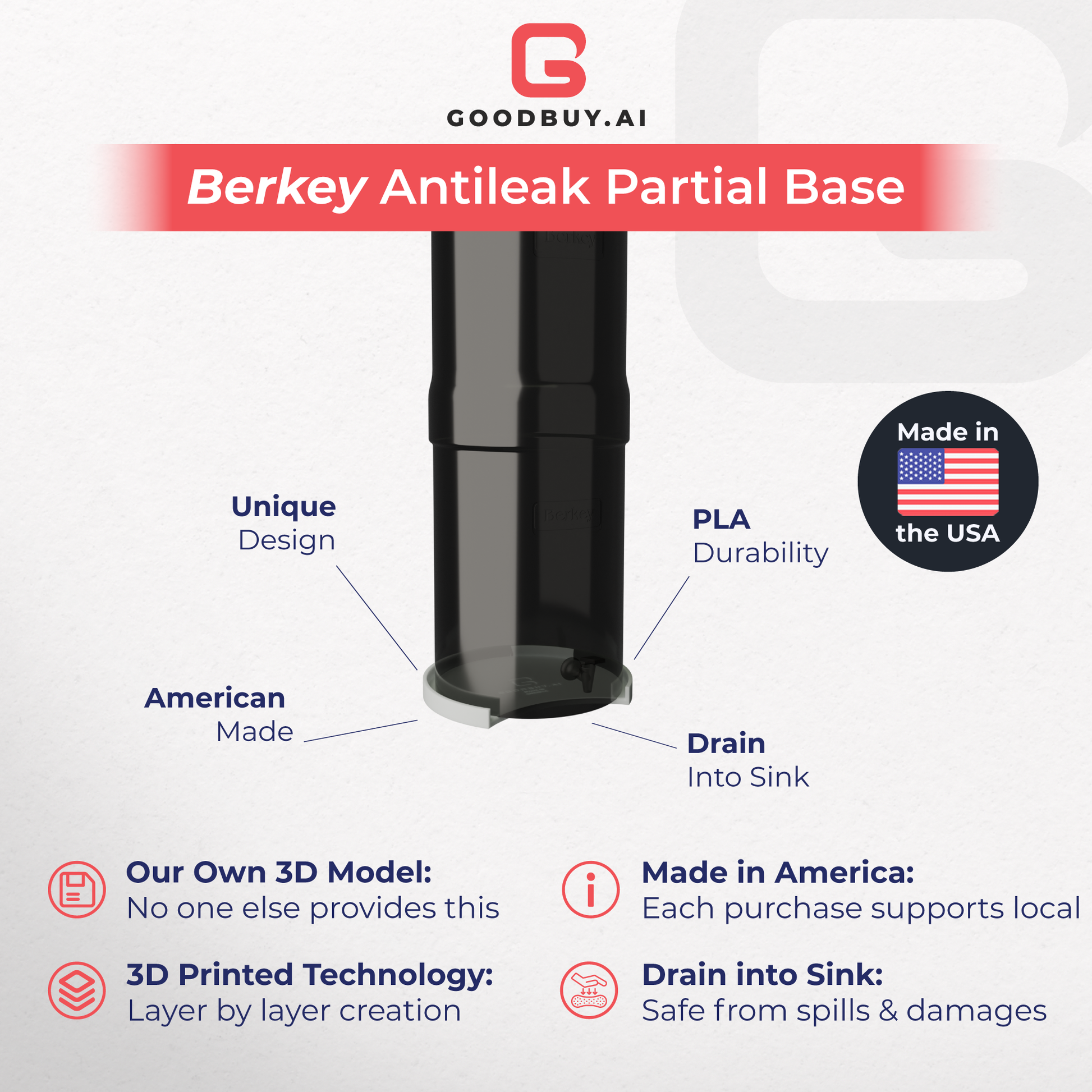 Keep Your Countertops Clean and Dry with the Berkey AntiLeak Base The Berkey AntiLeak Base is the perfect way to keep your Royal Berkey Water Filter System clean and dry. This sturdy base sits under your Berkey system and prevents any water from spilling over onto your countertops. It also features a built-in drip tray, so that any excess water is easily caught and drained. The Berkey AntiLeak Base is made in America by a family-owned business in Texas. It is made with 3D printed PLA technology, which is a sustainable and eco-friendly material. The base is also customizable, so you can contact us to order a different color. Features: - Prevents leaks from overfilling the Berkey containers - Built-in drip tray catches excess water - Made in America by a family-owned business - Made with 3D printed PLA technology - Customizable color options Benefits: - Keeps your countertops clean and dry - Prevents water damage - Prolongs the life of your Berkey system - Easy to use and maintain - Sustainable and eco-friendly